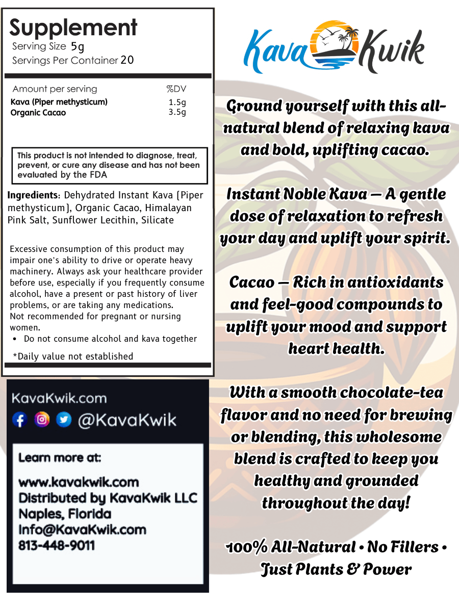 Calm meets cozy. We pair traditional instant kava with rich, organic cacao for a smooth, chocolate-forward drink that helps you unwind without alcohol—perfect for evenings, creative sessions, or post-work decompression.
